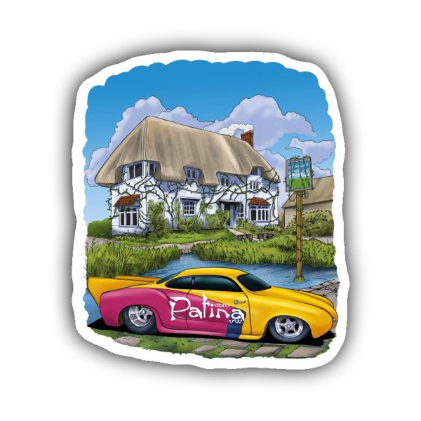 This design depicts a beautifully made tube frame drag racing ghia from America in the 90s in front of our local 17th century pub in the village that I grew up in. For those of you with keen eye may notice this car along with many others has suicide doors with the handle at the right hand side of the door.